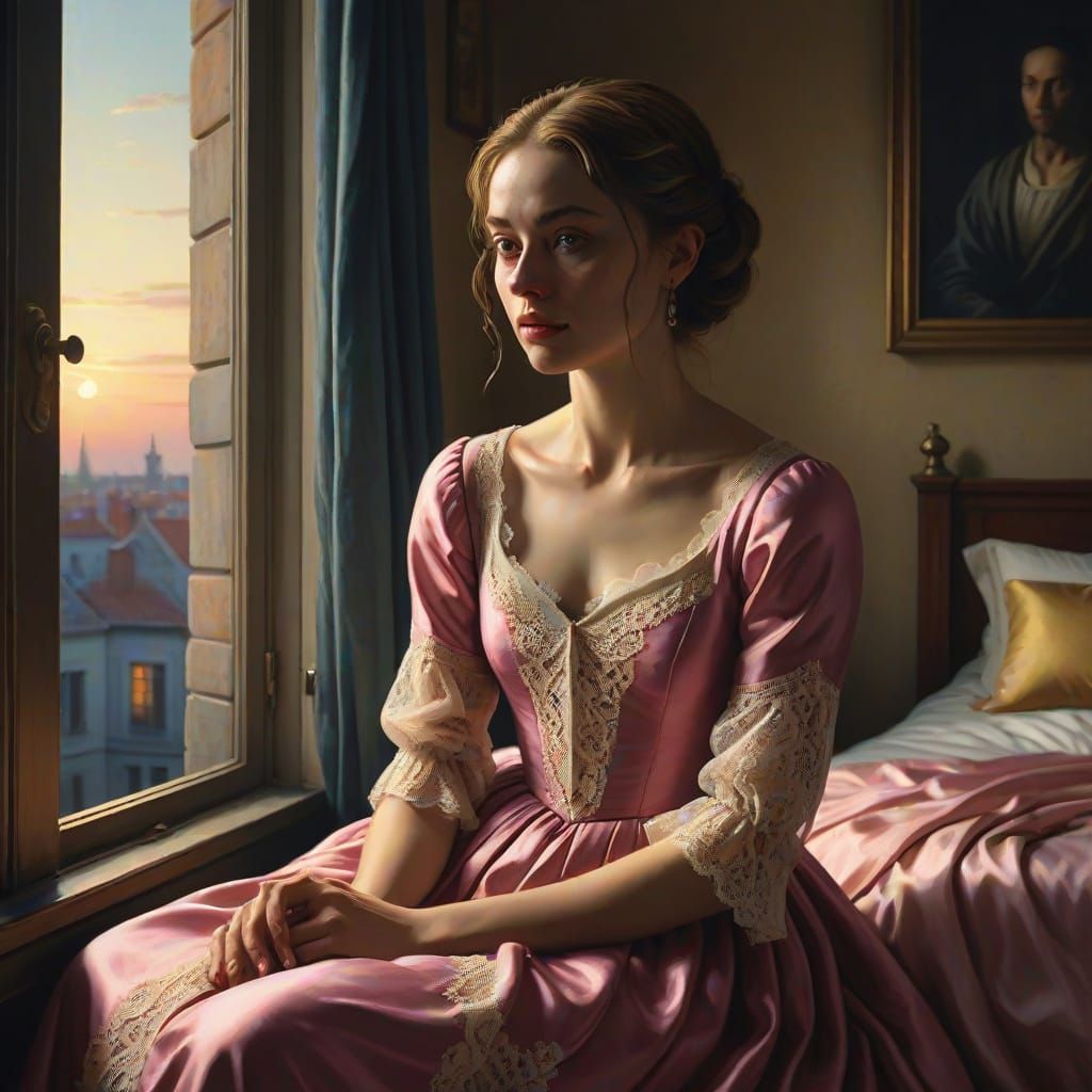 This image shows a woman sitting on a bed at night, bathed in soft light. Her satin dress shimmers with delicate lace in the style of an oil painting, with ultra-detailed textures in 8K resolution.