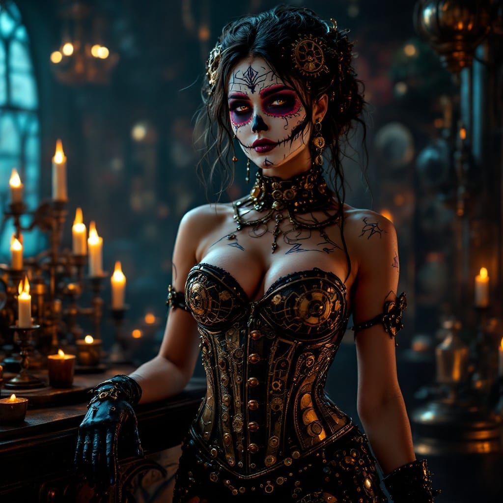This image showcases a strong, feminine figure in a romantic steampunk setting, surrounded by intricate clockwork machinery and vibrant Día de los Muertos-inspired face paint, evoking a sense of biomechanical wonder with its blend of organic and industrial elements, in a dreamy, 8k-resolution landscape