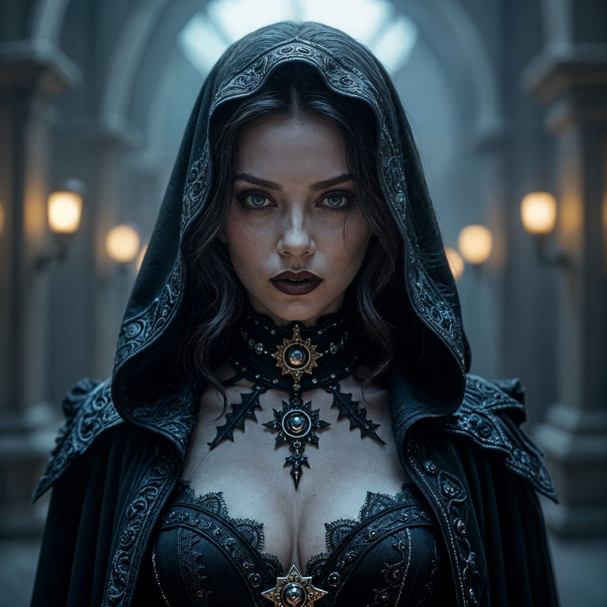 A photorealistic image of a goth female figure in occult attire. The scene is lit dramatically and rendered in 3D with intricate details, creating a macabre and cinematic aesthetic.
