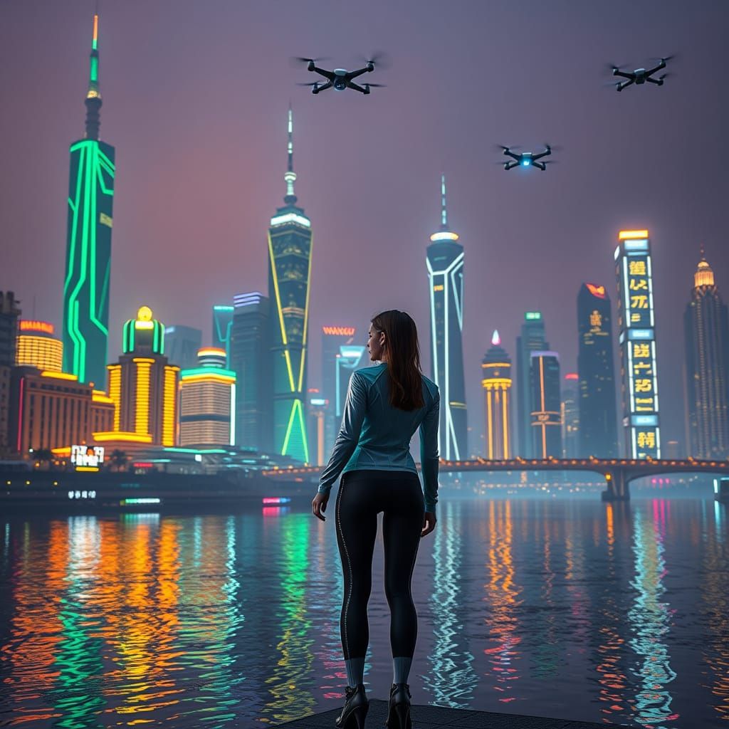Create your own futuristic cityscape images with our free AI image generator. Easily design stunning Chinese cityscapes at sunset, complete with neon-lit skyscrapers and flying drones.