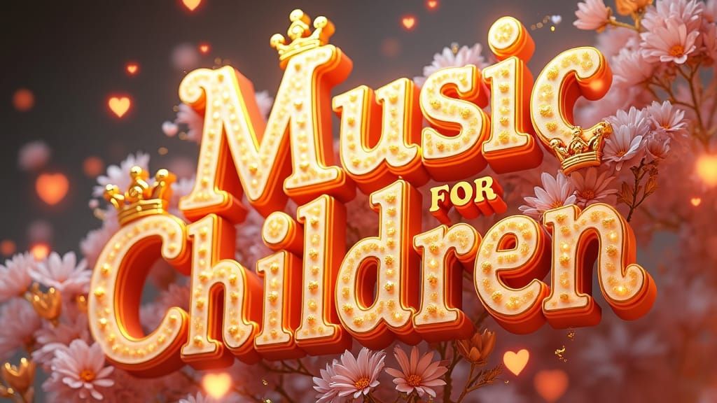 A striking 3D illustration spells out "MUSIC FOR CHILDREN" in an ornate font. The design features swirling patterns, hearts, crowns and glowing shapes, rendered in orange, white and gold, in a dreamlike aesthetic.