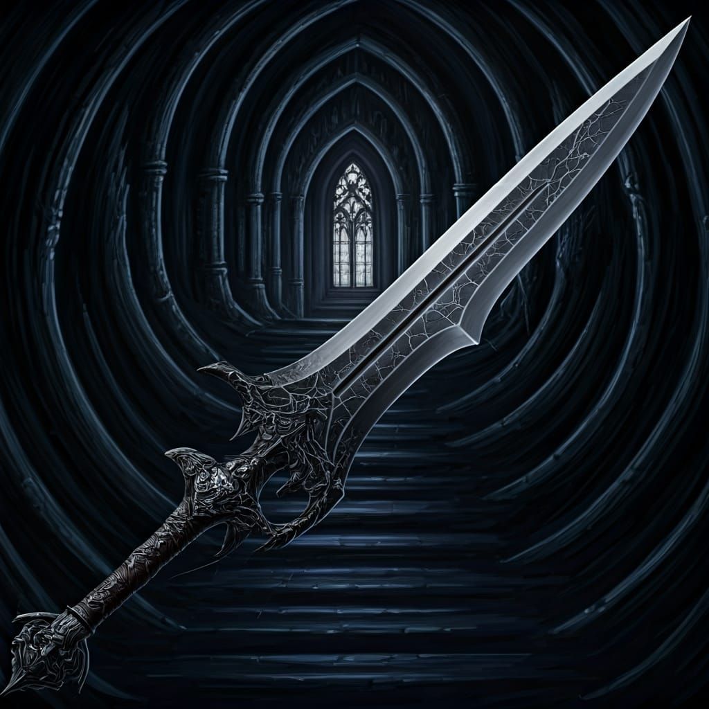 A dark blade featuring silver web-like veins and spider motifs. The gothic background and ominous atmosphere evoke a sense of mystery and danger in a dark fantasy style.