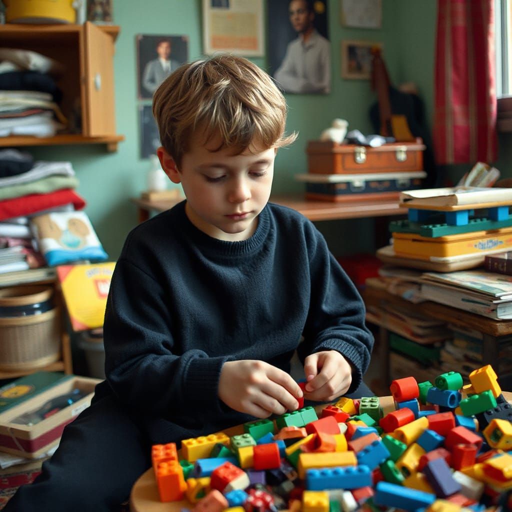 This image shows a young boy, Gunnar, engrossed in building with Lego bricks within a cluttered yet inviting room. The artwork has a nostalgic, youthful ambiance with vibrant colors and playful textures.