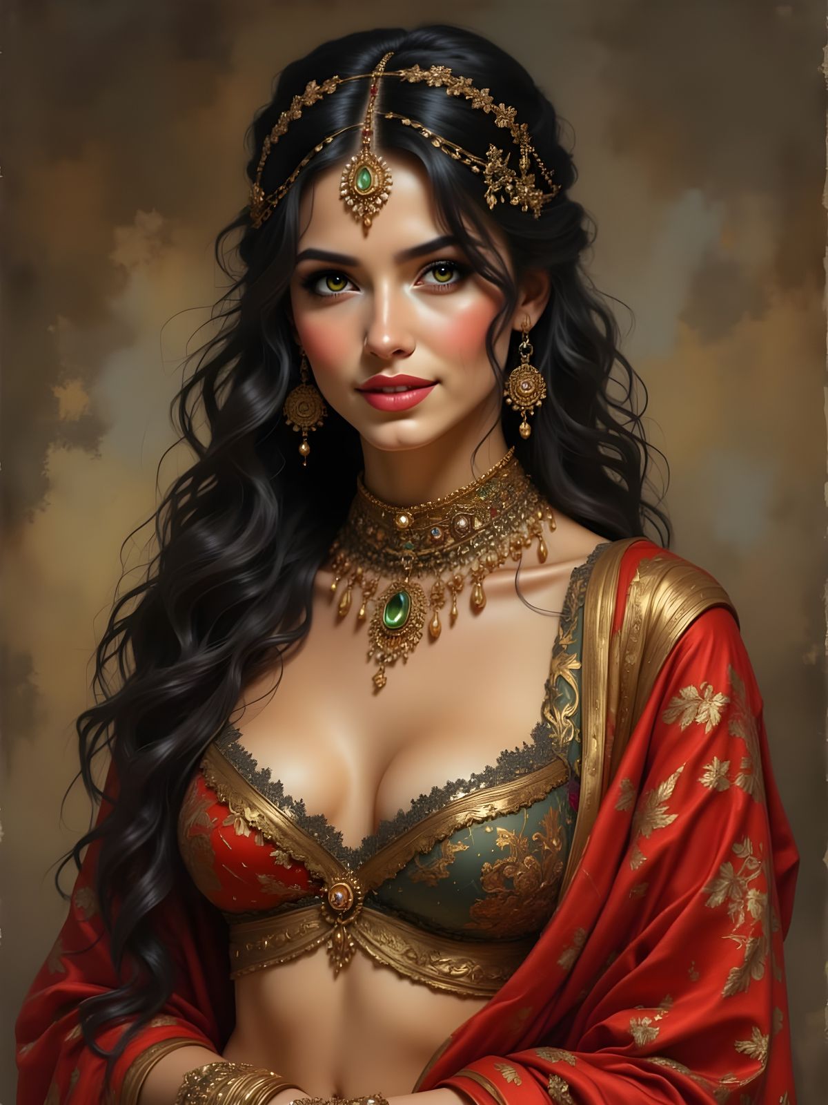 This image depicts an Arabian princess adorned in traditional clothing and jewelry. Rendered with painterly digital art techniques, it showcases intricate details and vibrant aesthetics.