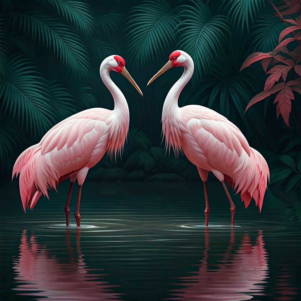 This image shows pink cranes standing in a calm pond, reflected in the water. The digital painting features cinematic lighting, a lush tropical environment, and ultra-detailed, realistic textures.