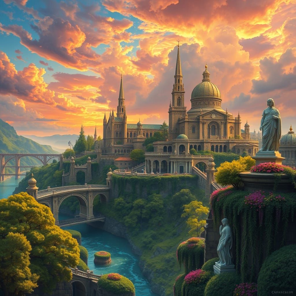 This image showcases a majestic fantasy city set amidst lush vegetation and serpentine rivers, with intricate architecture, elegant bridges, and grand statues, all bathed in a kaleidoscopic sky with hues of blue, amber, and crimson, evoking the Solarpunk spirit of ecological harmony and innovation.