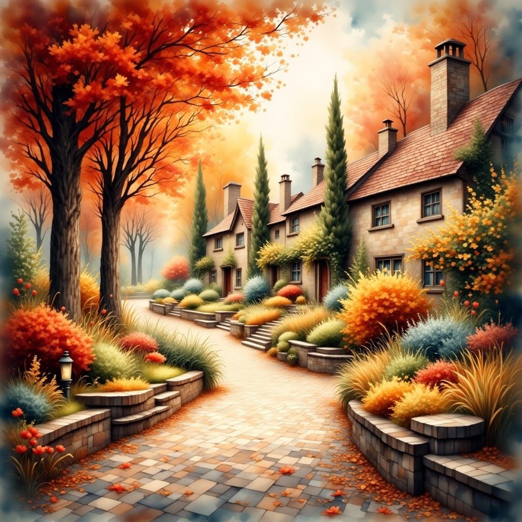 This image shows a charming autumnal village scene with a winding cobblestone path. Radiant trees display red, gold, and blue hues, reminiscent of watercolor art, in a whimsical landscape.
