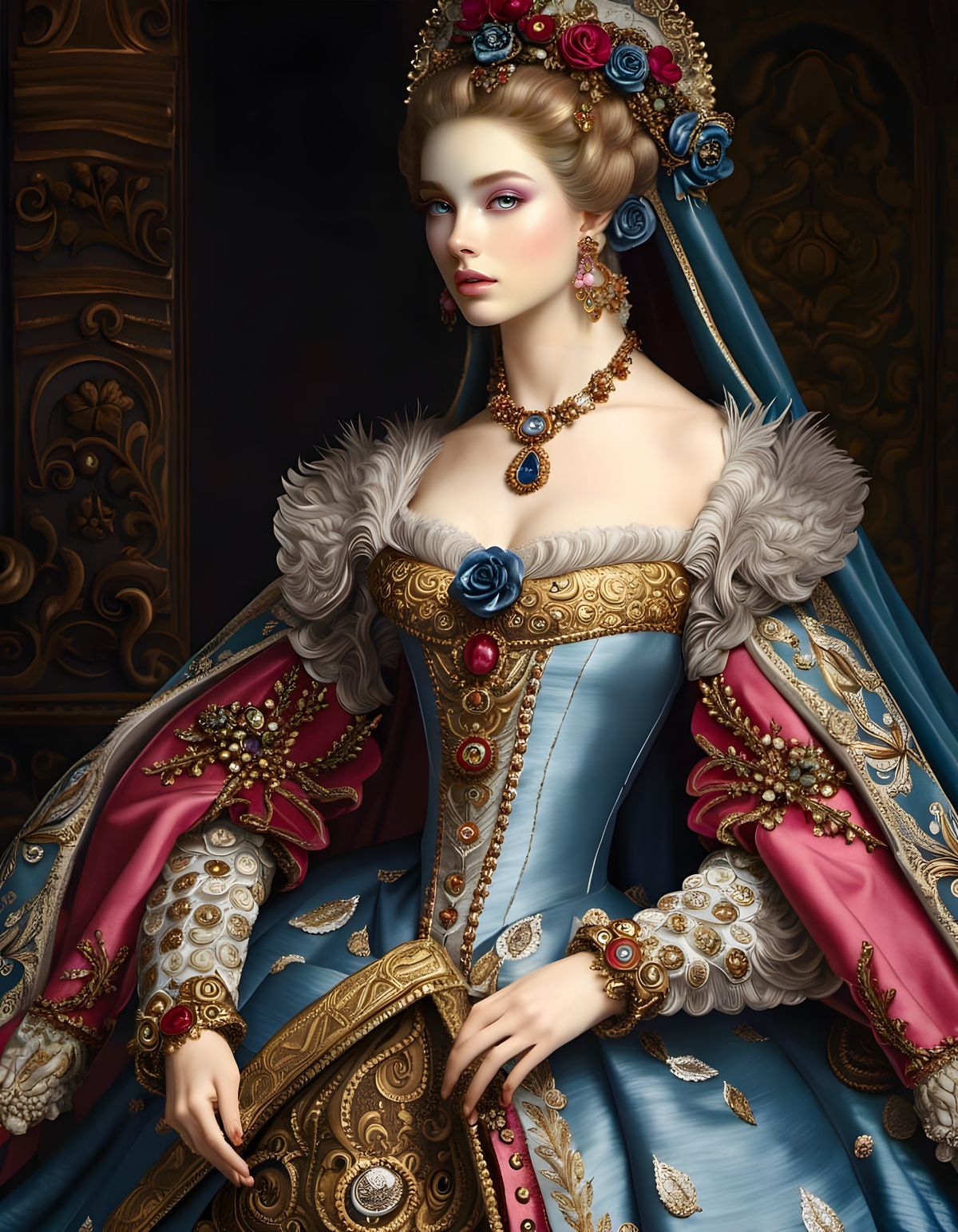 This image shows a beautiful doll surrounded by intricate 3D flowers in a vibrant fantasy setting, created with meticulous attention to detail and ornate baroque flair.