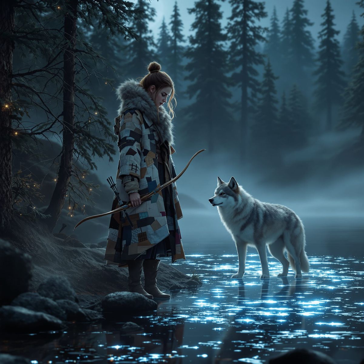 A tense cinematic scene of a girl and her wolf at a glowing, moonlit forest river. Mist and shadows hint at danger in this realistic fantasy adventure.