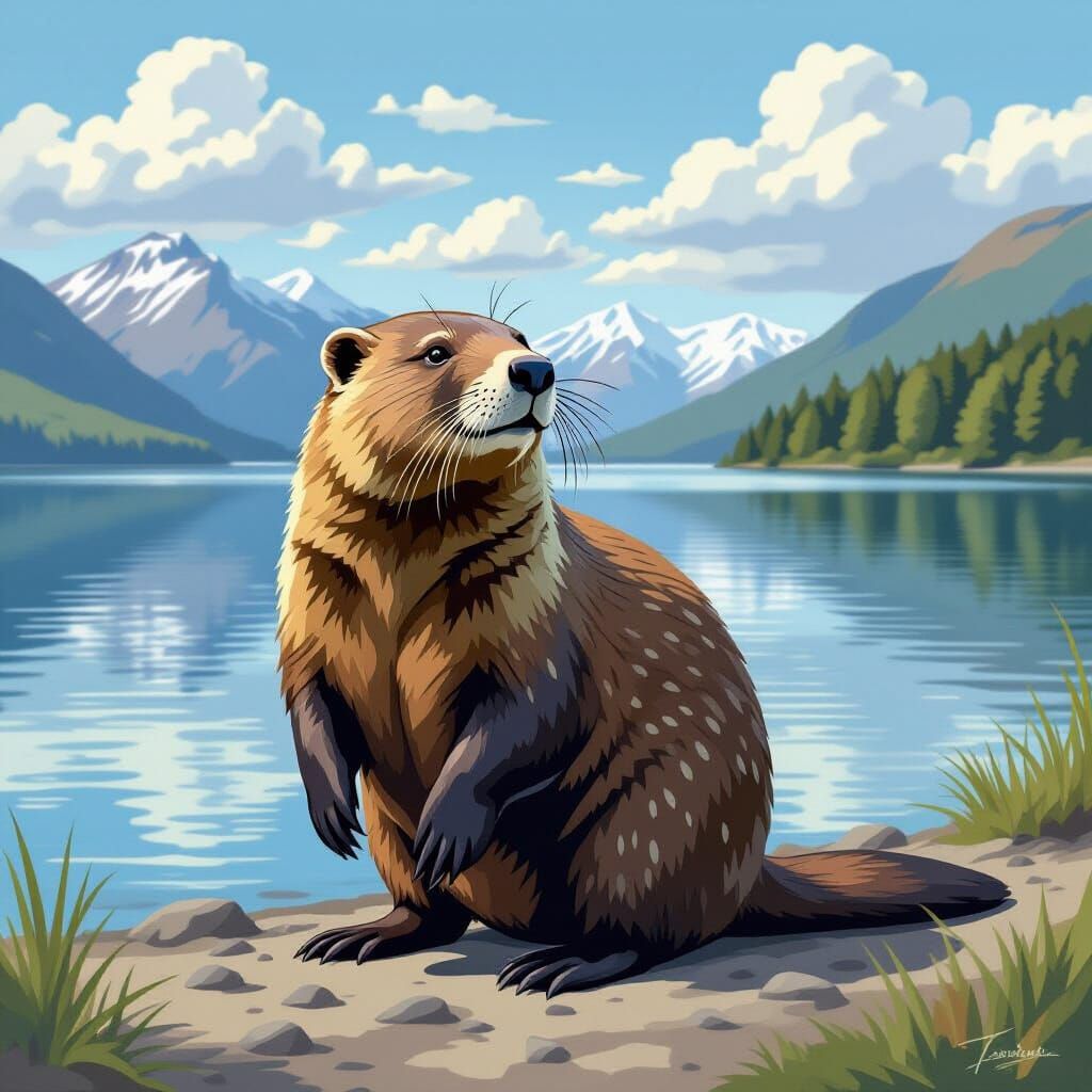 A charming image of a spotted aquatic mammal relaxing on a New Zealand lake shore. The artwork blends whimsical realism with earthy tones and a dreamy, serene quality.