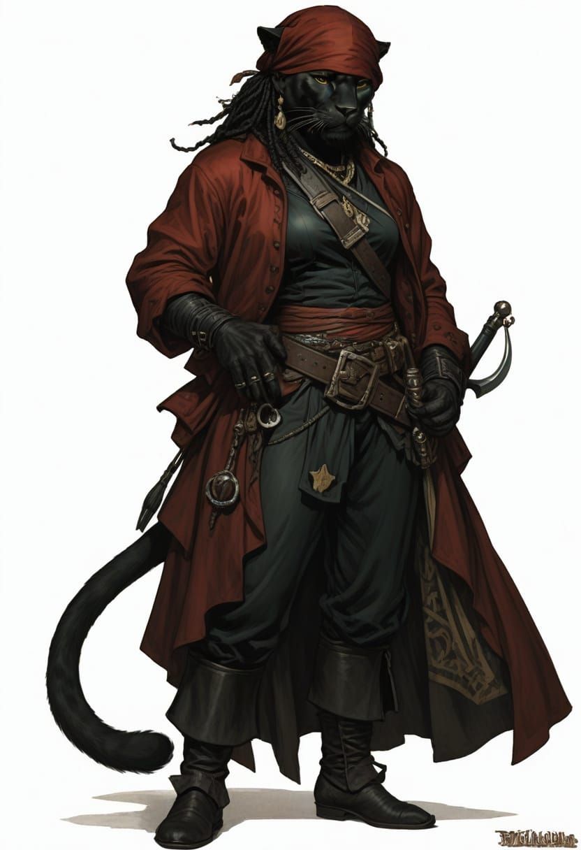 This image shows a heroic fantasy illustration of a powerful female black panther pirate in 18th century Caribbean attire, blending vivid colors and bold outlines in a style reminiscent of classic fantasy art.