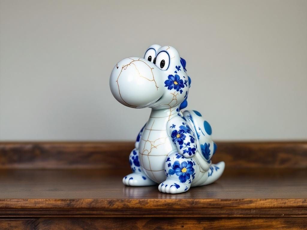 This image shows a handcrafted porcelain Yoshi figure on a lacquered shelf. The figure features blue and white floral patterns with gold kintsugi repairs, presented as fine art ceramic still life.