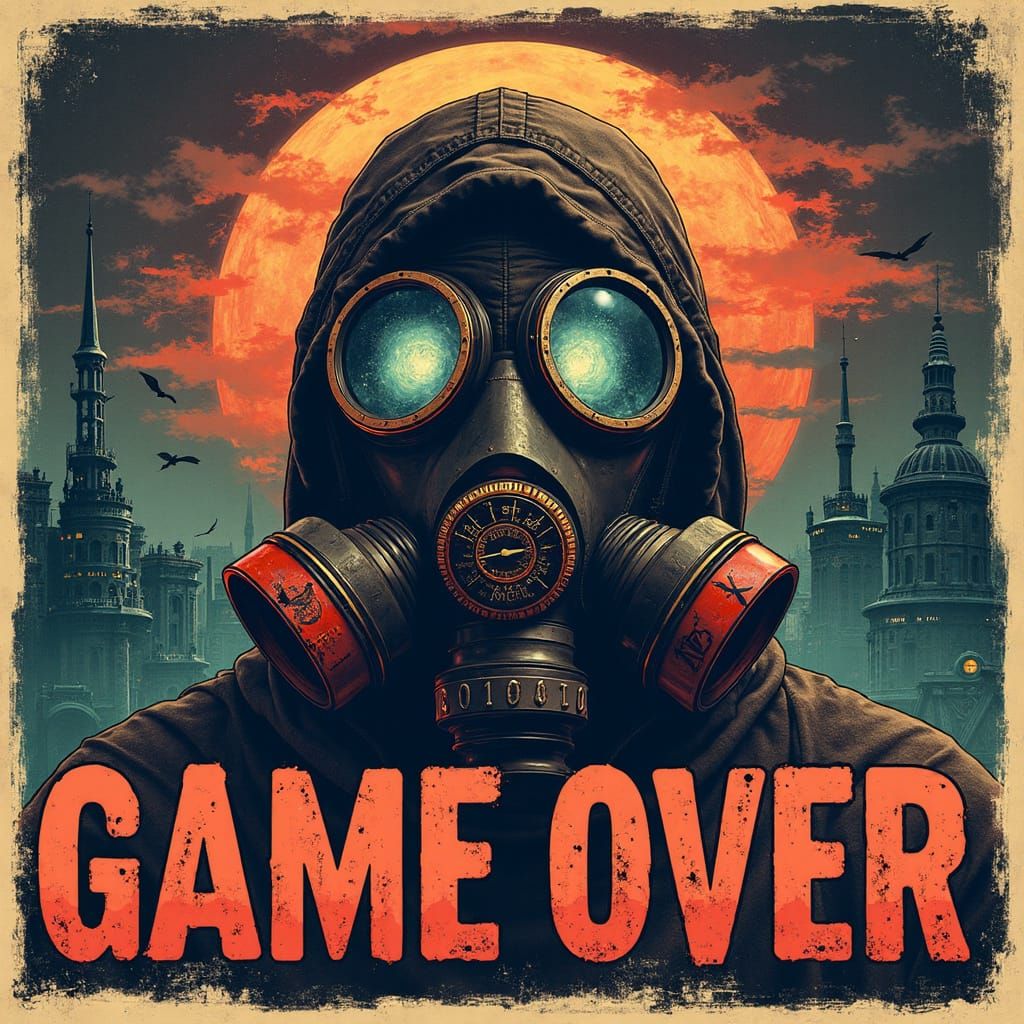 This image shows vintage album cover art featuring a gas mask. The artwork evokes retro horror and a dark sci-fi city, with bold text "GAME OVER" in a retro sci-fi graphic style.