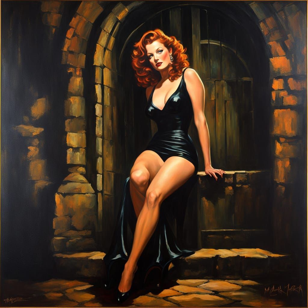 A dark oil painting of a beautiful woman with a mischievous smile standing in a castle dungeon. The artwork evokes an impressionistic horror aesthetic with ominous undertones.