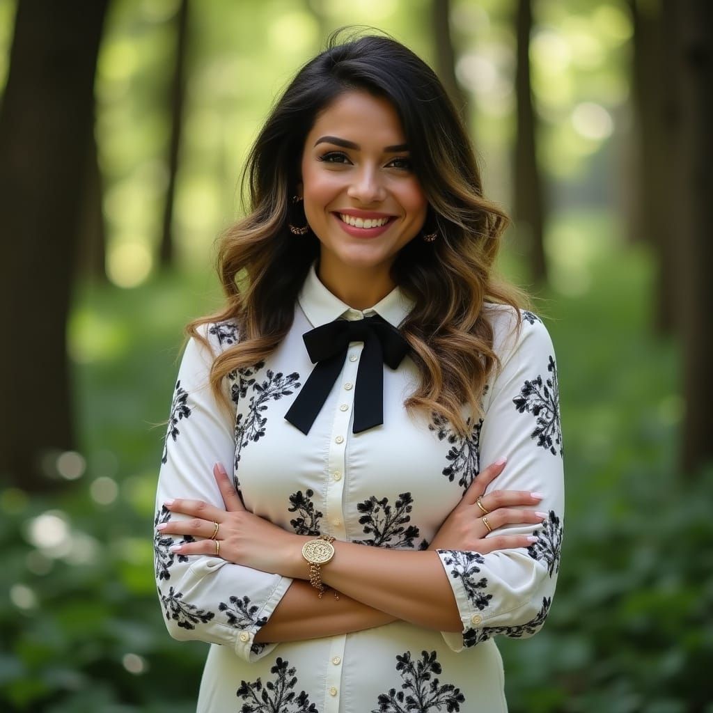 This image shows a curvy Spanish teacher with long black hair and gold jewelry, wearing a floral dress and boots. She stands beaming in a lush emerald forest.