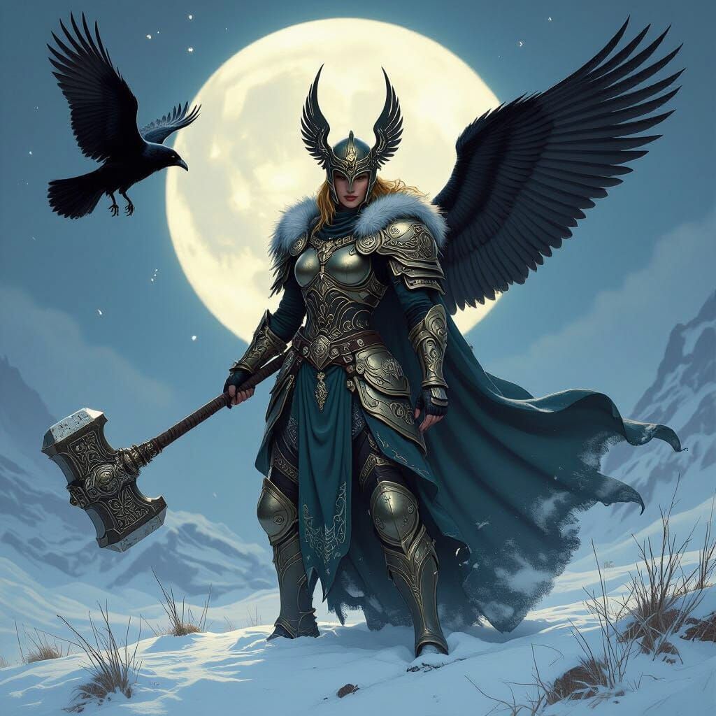 A powerful Valkyrie warrior stands on a snowy battlefield. She wears Norse armor and a winged helmet, wielding a warhammer, with a raven flying overhead. The image is rendered with Art Nouveau lines and dramatic lighting.