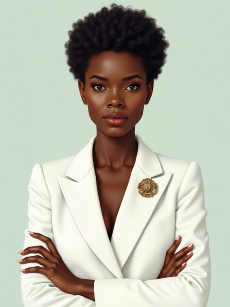 A striking picture of a Black woman with short curly hair and a white blazer. Soft lighting accentuates her features in this medium shot, reminiscent of classic portraiture.