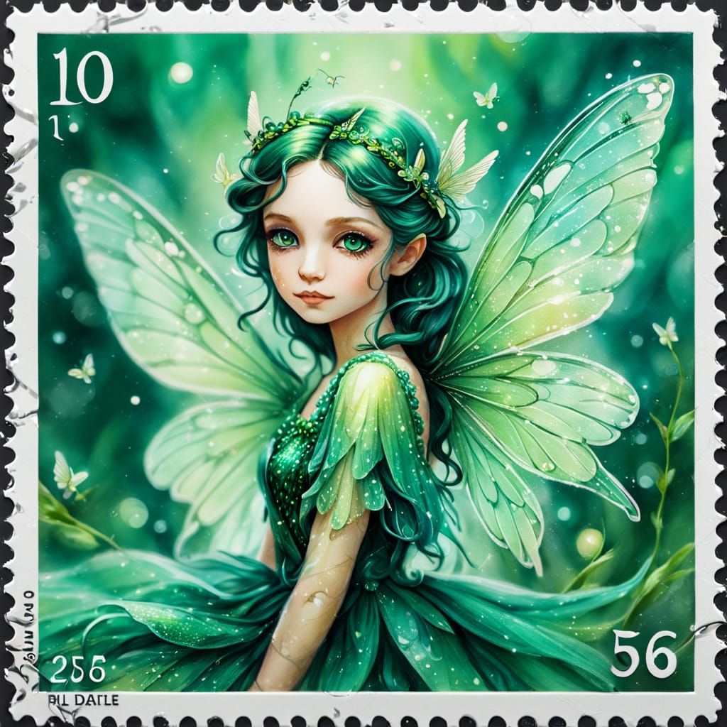 This image captures a detailed close-up of an emerald green fairy on postage stamps, rendered in a whimsical, pastel art style with shimmering wings.