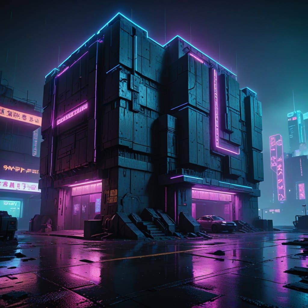 This image shows a cyberpunk fortress nestled in the Himalayas, illuminated by neon lights. The scene features wet pavement reflecting the neon glow, with fog accentuating the dystopian atmosphere. The color palette emphasizes dark blues and purples.