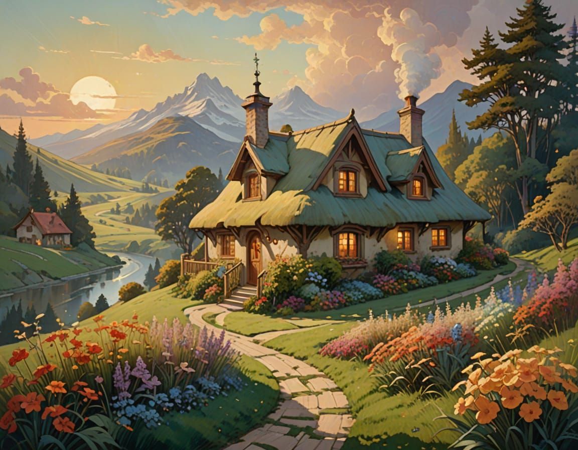 This serene image captures a whimsical cottage nestled in a rolling valley, surrounded by vibrant flowers and misty atmosphere, bathed in warm golden light, reminiscent of Art Nouveau elegance and Thomas Kinkade's signature style.