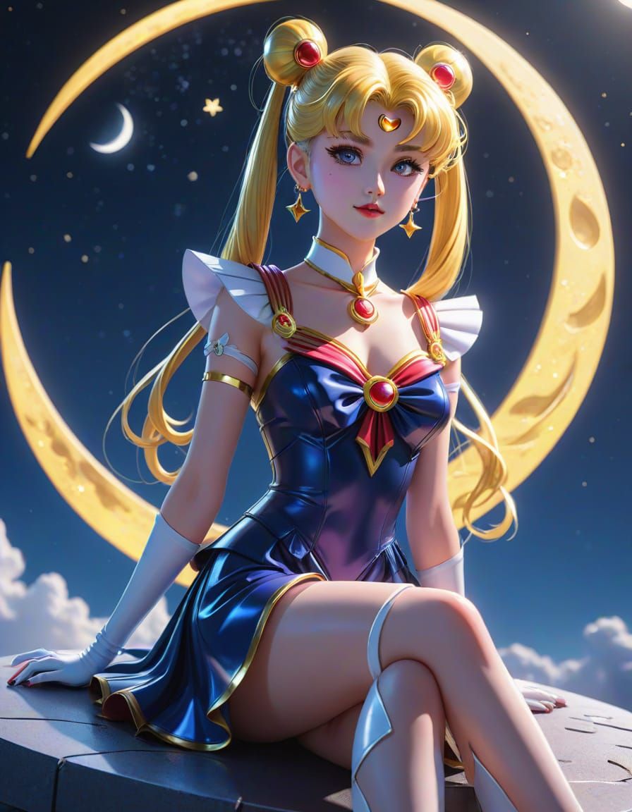 This image shows a 3D anime-style rendering of Sailor Moon. She is sitting on a crescent moon wearing a detailed latex dress and stiletto heels. The art features vibrant colors and soft moonlight.