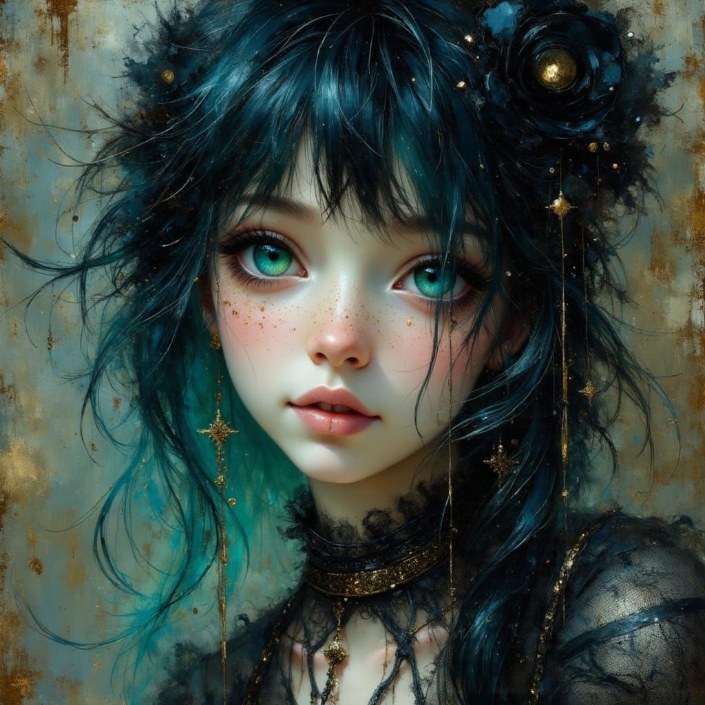 A close-up portrait of a goth punk woman with wild black-blue hair, green eyes and freckles. The image, in a soft grunge style, has a magical and ethereal aesthetic.