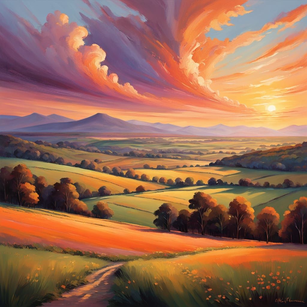 This serene landscape painting captures the breathtaking beauty of a sunset over rolling hills and towering trees, with warm golden light and soft pastel hues blending into deep oranges and purples.