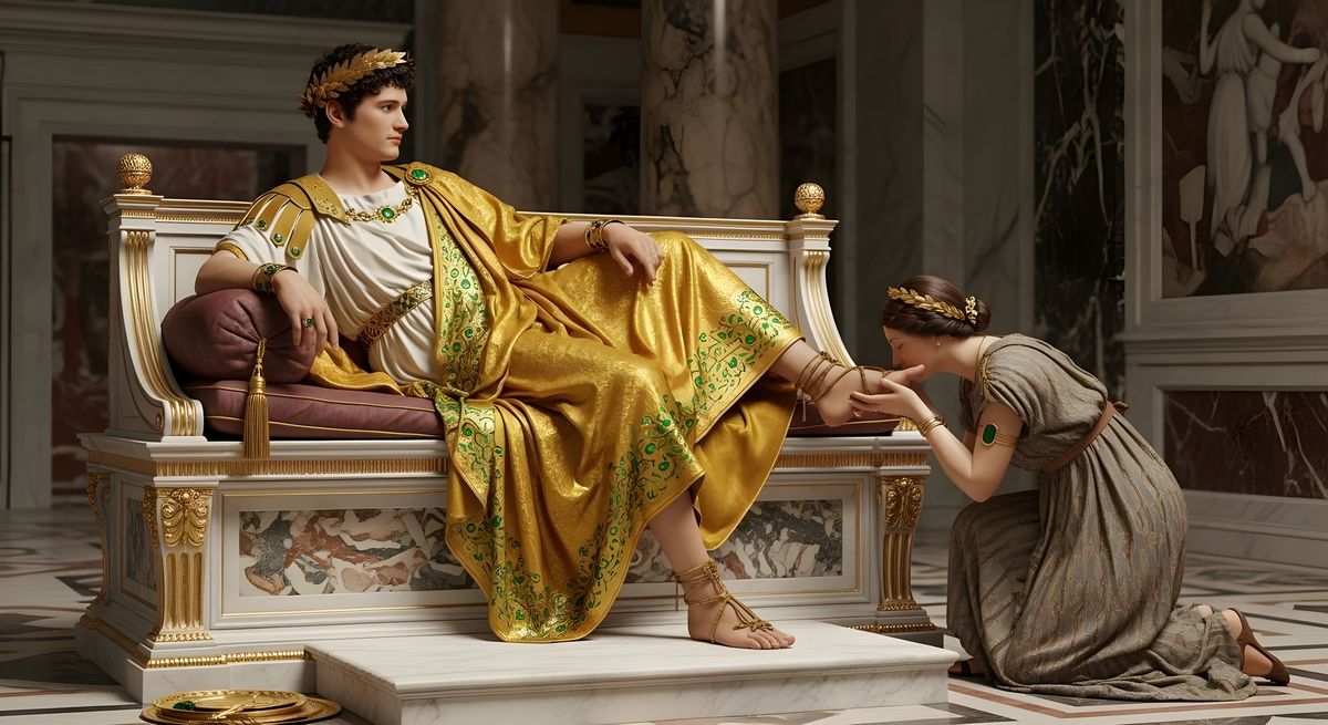 This image shows Emperor Nero in a throne room, reclining on a triclinium made of marble, gold and emerald. He is wearing a gold toga and wreath crown, rendered with photorealistic detail and natural lighting.