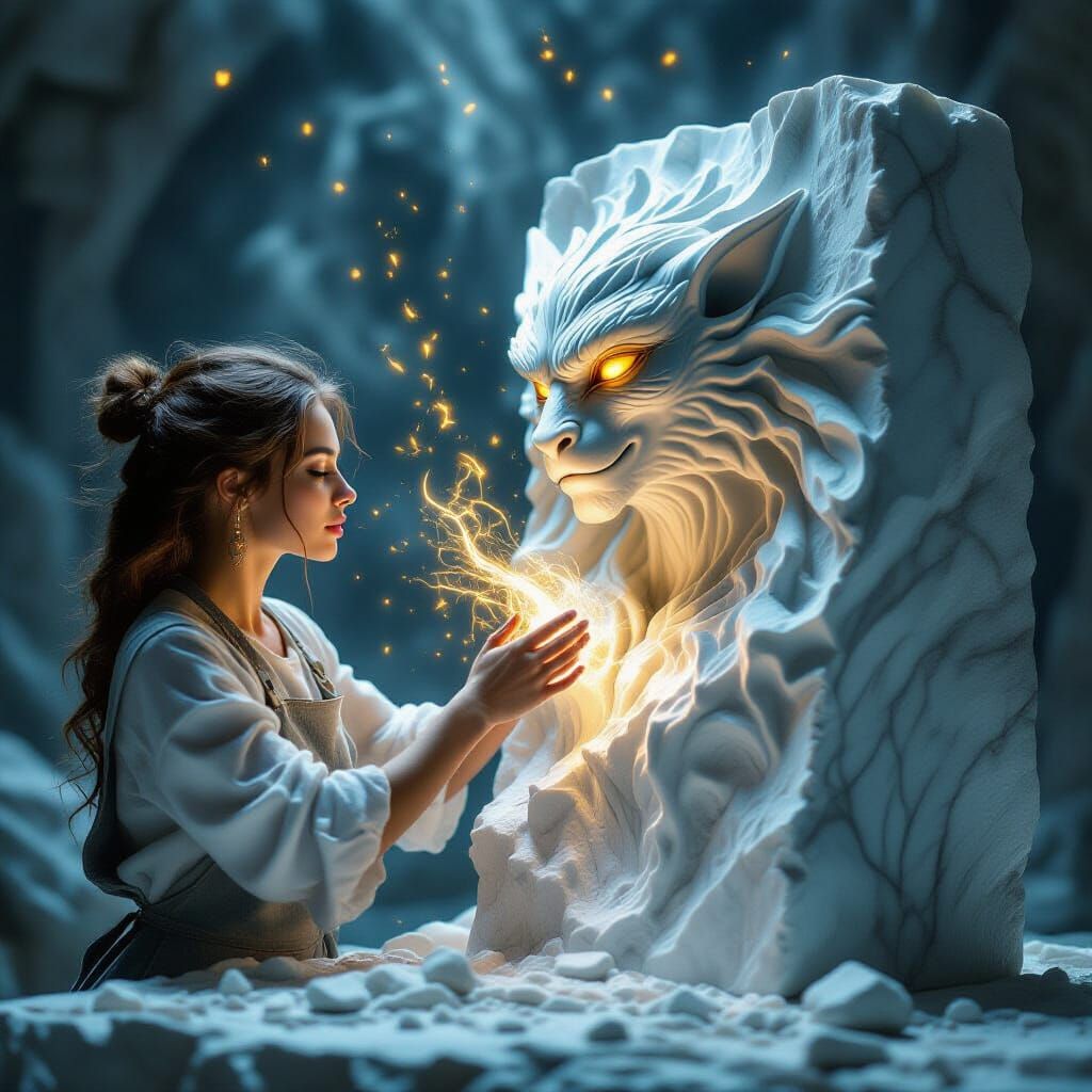 This image depicts a sculptor channeling magical energy to effortlessly extract a detailed sculpture from a block of stone, showcasing a blend of fantasy and artistry.