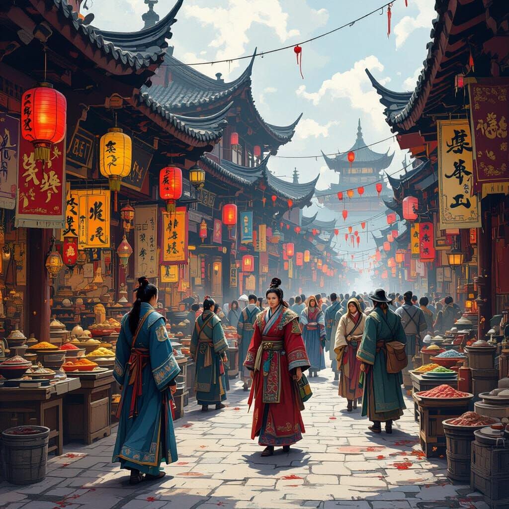 This image shows a busy marketplace scene with merchants, artisans, and travelers. The artwork evokes the style of digital painting, with intricate details and a rich, complementary color palette.