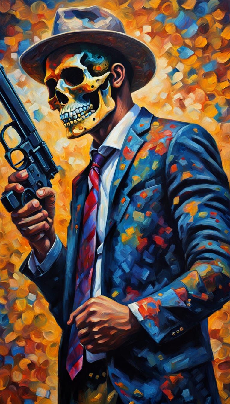 A striking picture of a man holding a candy skull and gun. The image is rendered in an expressionist neo-impressionism style, with vibrant colors and thick, textured paint.
