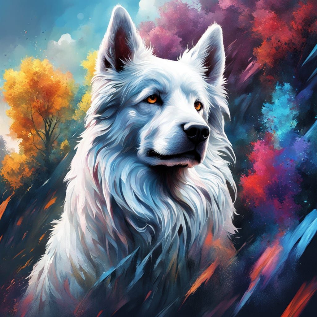 A detailed charcoal drawing of a white Swiss Shepherd dog. The image features deep colors, intricate details, and a fantasy concept art style, reminiscent of gouache and watercolor techniques.