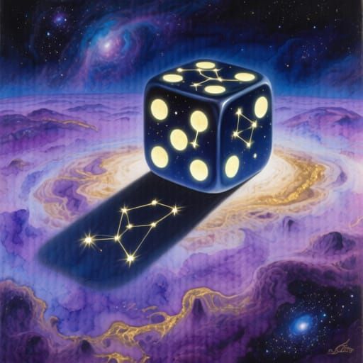 This hyperrealistic painting features a giant die with celestial markings, casting a distorted shadow over a vibrant nebula. Experience a dreamlike surrealist vision.