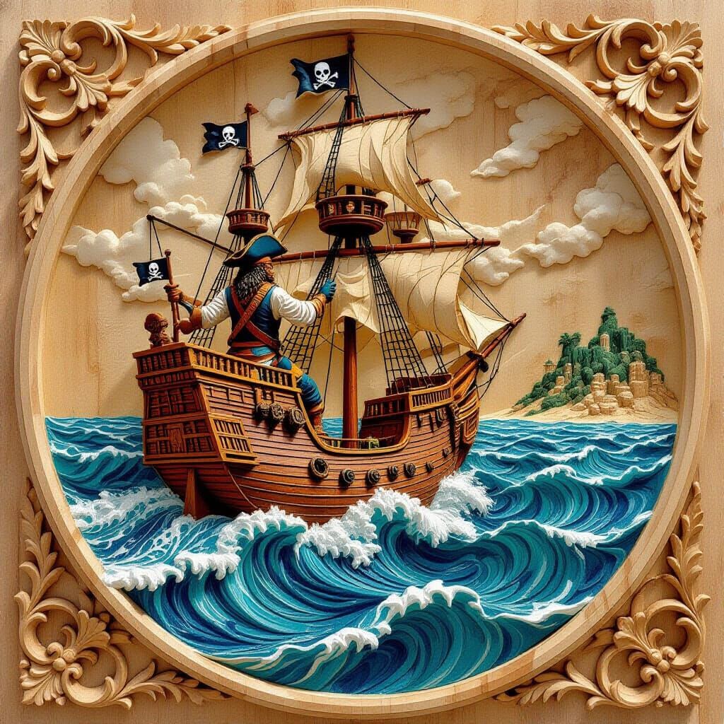 Create your own stunning bas relief art featuring pirates, ships, and treasure islands with our free AI image generator.