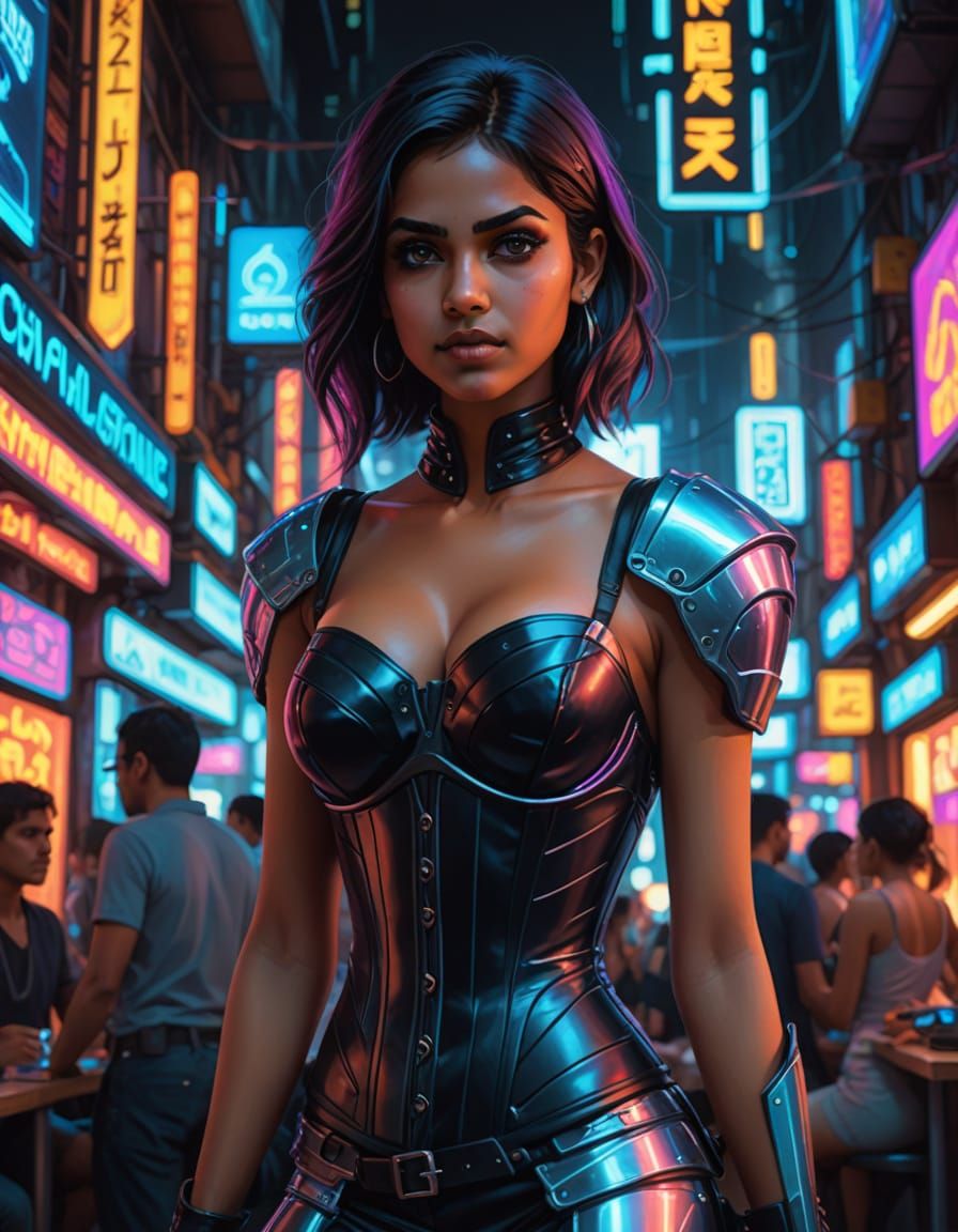 This image shows a woman in a corset and micro skirt sitting in a futuristic marketplace. Neon lights illuminate her face, while metallic accents shimmer on her outfit in a cyberpunk aesthetic.