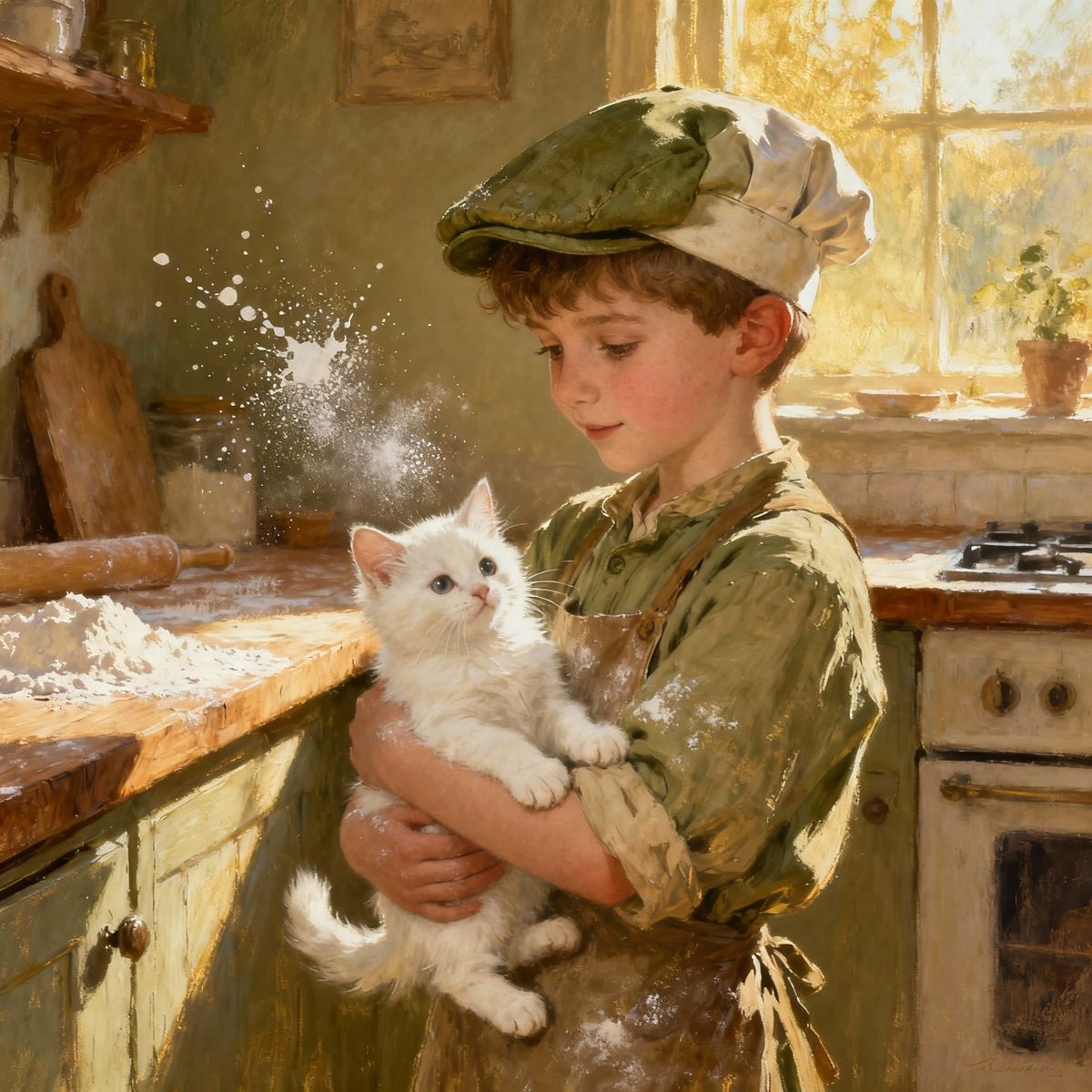 Vintage art, olive and tan hues, sunny day, little boy baker boy cap with white kitten, textured clothing, splash art, in style of JK, Dante Gabriel Rossetti, Yossi Kotler, Camilla D'Errico, masterpiece, fine art in style of Carne Griffiths, Paula Hoppe