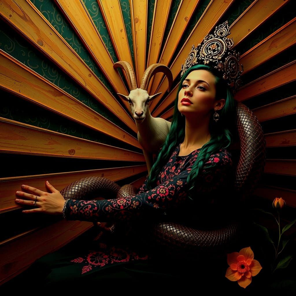 This striking image depicts a mythical chimera with lion, goat, and snake features, adorned with teal hair and a yellow flower, rendered in a hyper-realistic 3D mosaic style.