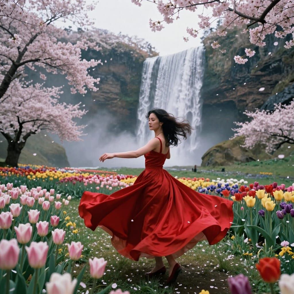 A cinematic film still of a woman in a flowing crimson gown dancing among vibrant tulips and wildflowers, with cherry blossoms and a distant waterfall. Expertly color graded for dramatic effect.