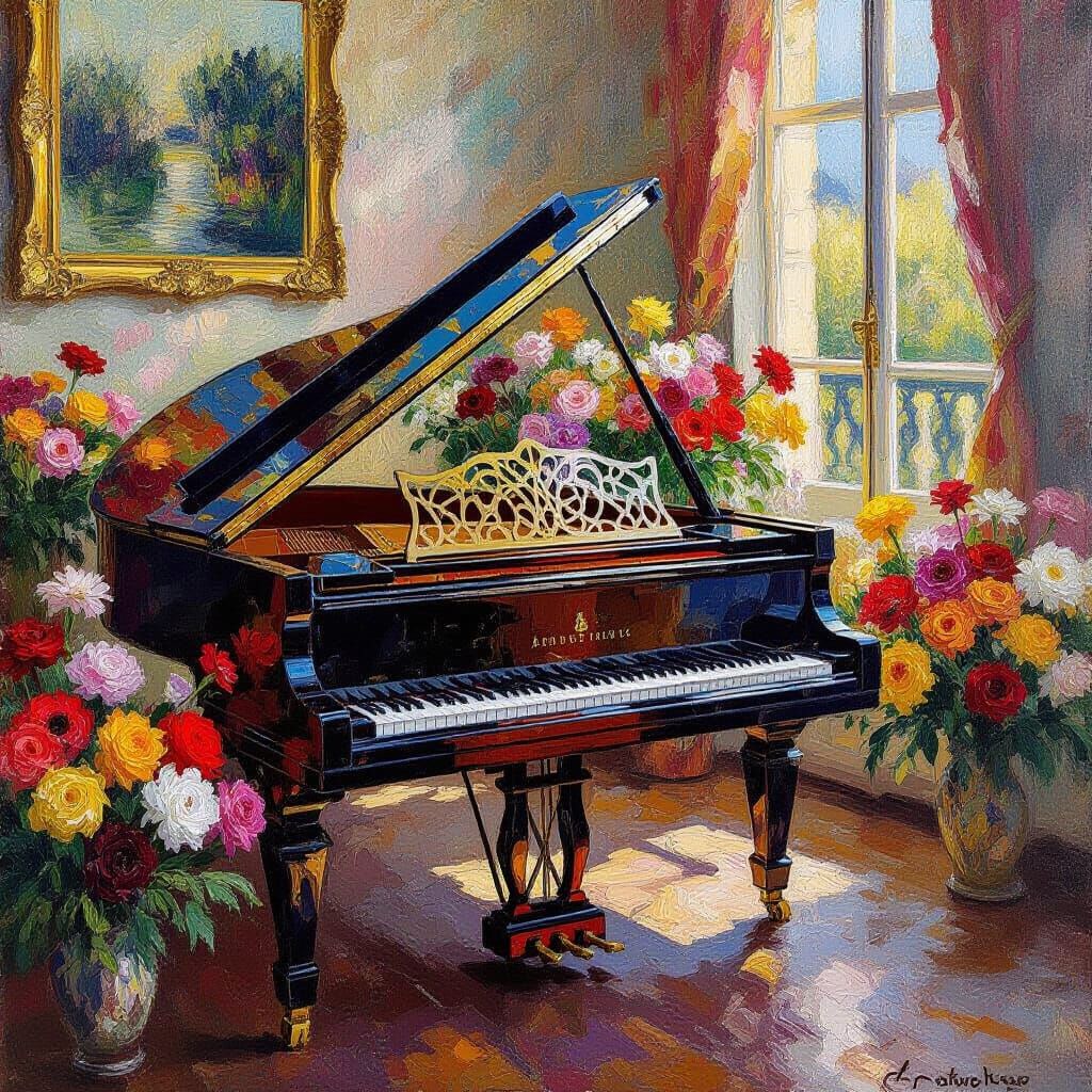 A grand piano sits in a richly decorated room filled with vibrant flowers, rendered in a thick, textured oil painting style with warm, inviting light.