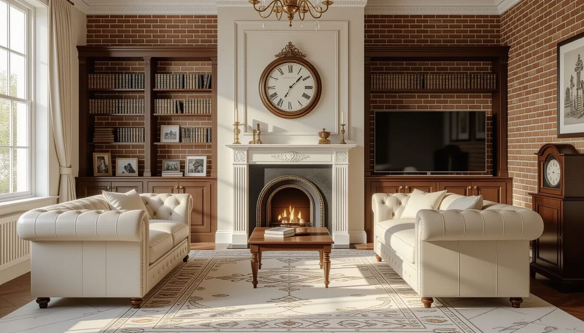 This image shows a sunlit Victorian living room featuring an ivory L-shaped sofa, a fireplace, and brick wallpaper. Rendered in a realistic digital painting style with cinematic lighting.
