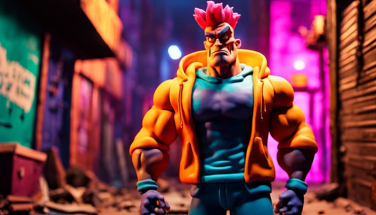🗑💥YEET Dumpster Fire Extra Large Fogel Edition Claymation male bodybuilder in Yeet hoodie, with bold neon hair, posing in dumpster fire alleyway, soft diffused lighting, glossy clothing a...