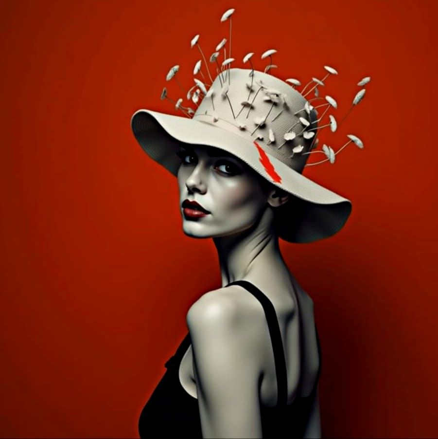 This striking black and white portrait features a woman wearing an artistic hat, with her face shadowed and a single vibrant crimson streak adding a dramatic contrast.