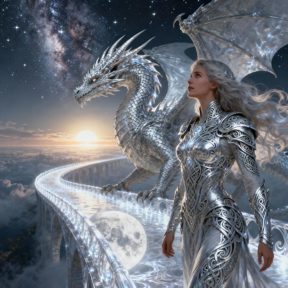 A hyperrealistic 8K image shows a woman in Celtic armor beside her dragon on a moon bridge, with Andromeda stars and a glowing dawn. The scene blends futuristic and mythical elements with ethereal silver light.