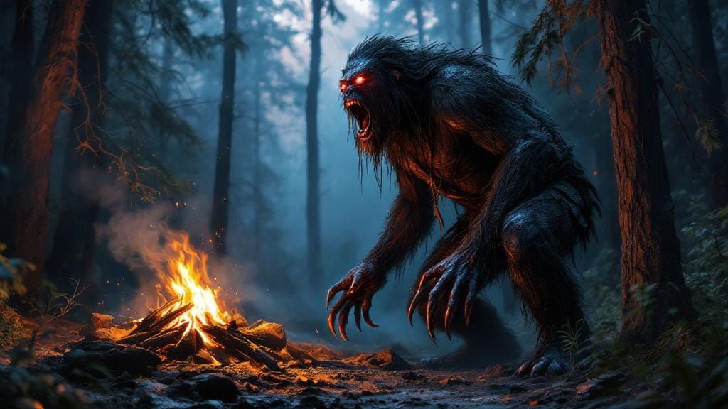 A dramatic image of a bigfoot-like man howling in a forest clearing at night. The figure, with glowing red eyes and tattered clothes, stands near a campfire in hyperrealistic style.