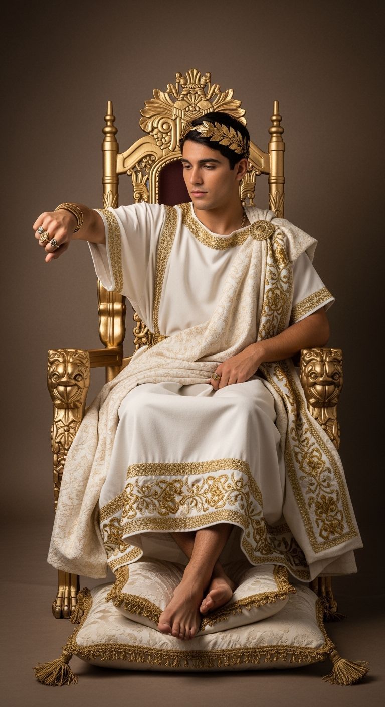 This image shows a youthful Roman emperor seated barefoot on a golden throne. He is adorned in white and gold regalia, captured in exquisite detail with soft lighting and bokeh.