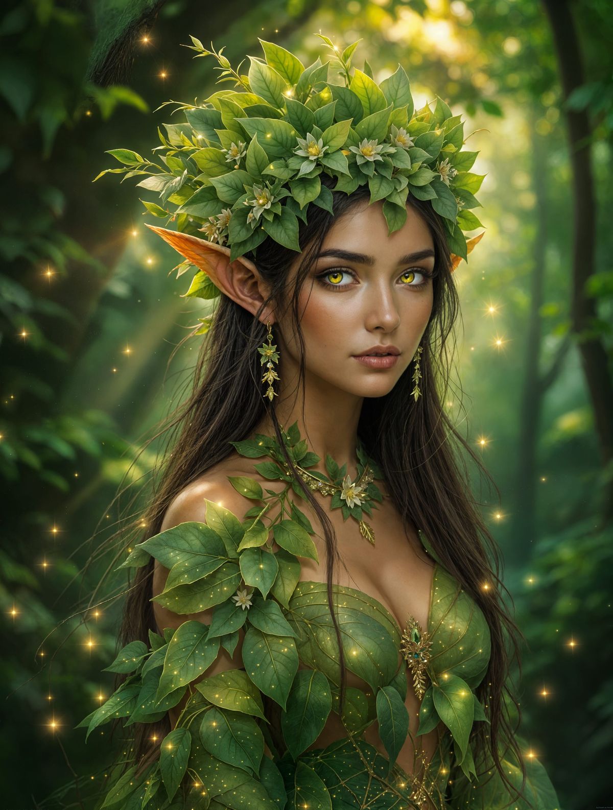 A serene forest nymph is adorned with a stunning headdress of softly glowing leaves and flowers, set against a warm, impressionistic forest background with dappled light effects.