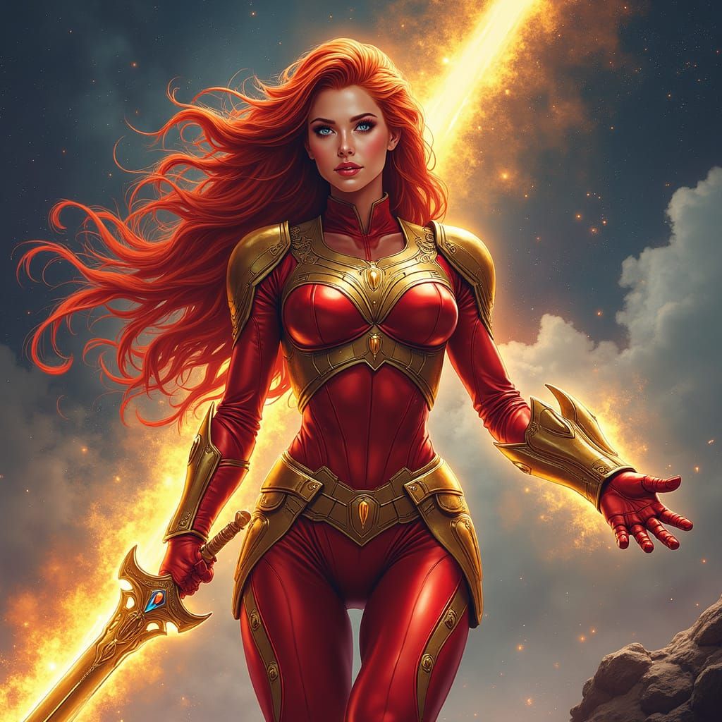 This image depicts Angela, a powerful warrior with fiery red hair, wielding a glowing sword and Infinity Stones gauntlet. She is clad in detailed red and gold Asgardian armor, set against a vibrant cosmic backdrop.