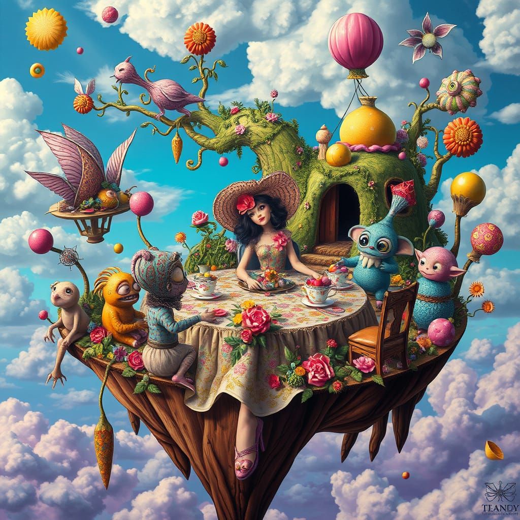 A surreal image of a woman hosting a psychedelic tea party on a floating island. The scene features colorful beings, lush vegetation, and candy art with graffiti and street art elements in a Takashi Murakami-inspired style.