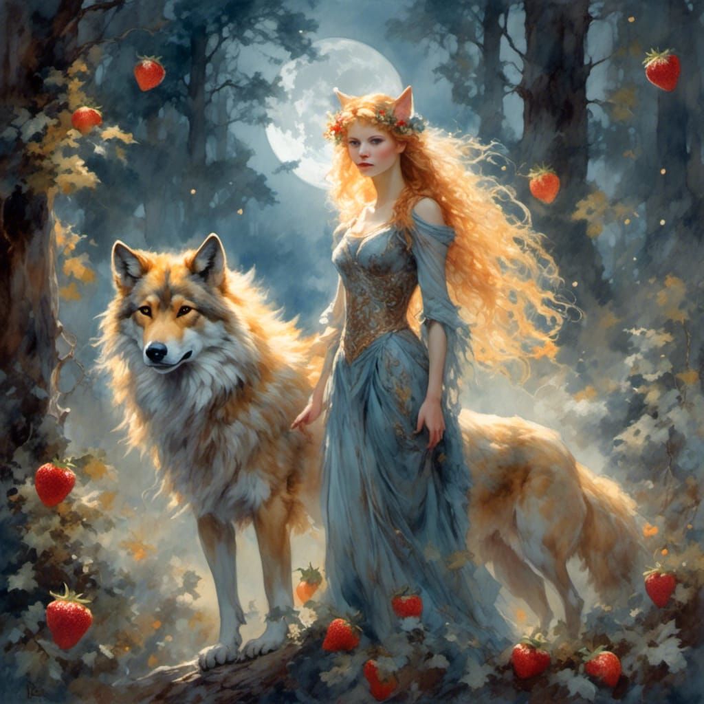 A striking image of a strawberry-blonde woman merged with a wolf, exuding strength and courage. Set against a misty forest, the artwork blends whimsical character design with empowering mysticism.