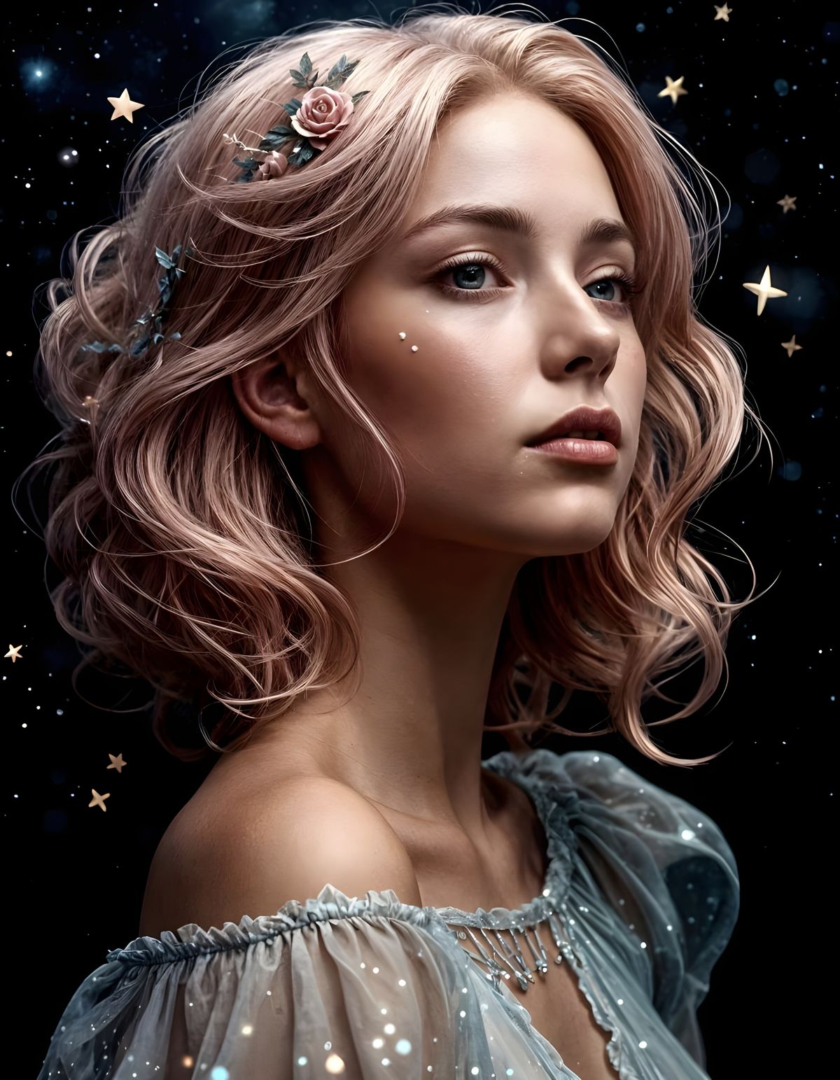 Generate your own dreamlike portraits with shimmering rose hair and starry skies. Free and easy to use!